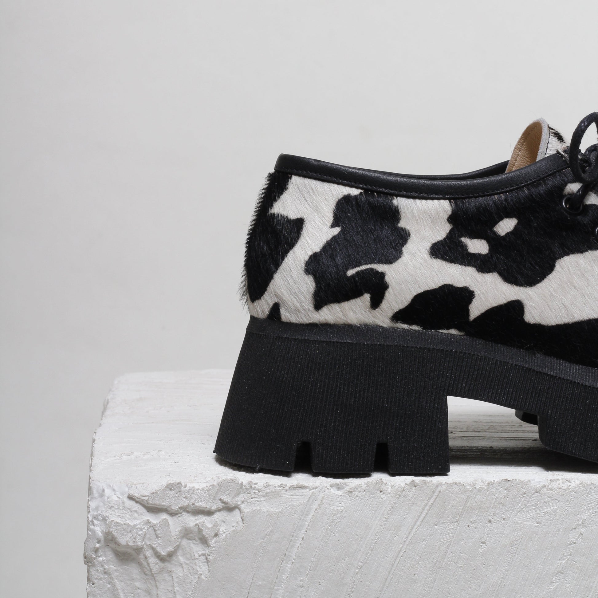 The Naomi Cow Print Chunky Loafer brings 90s-inspired style with a modern twist. Available in black, burgundy, and cow print, these loafers feature fabric laces and deliver exceptional comfort. Their chunky soles offer temperature isolation, making them ideal for cooler months. Equally elegant with tights, socks, or bare legs, they are a versatile, contemporary choice that brings effortless style to any outfit.