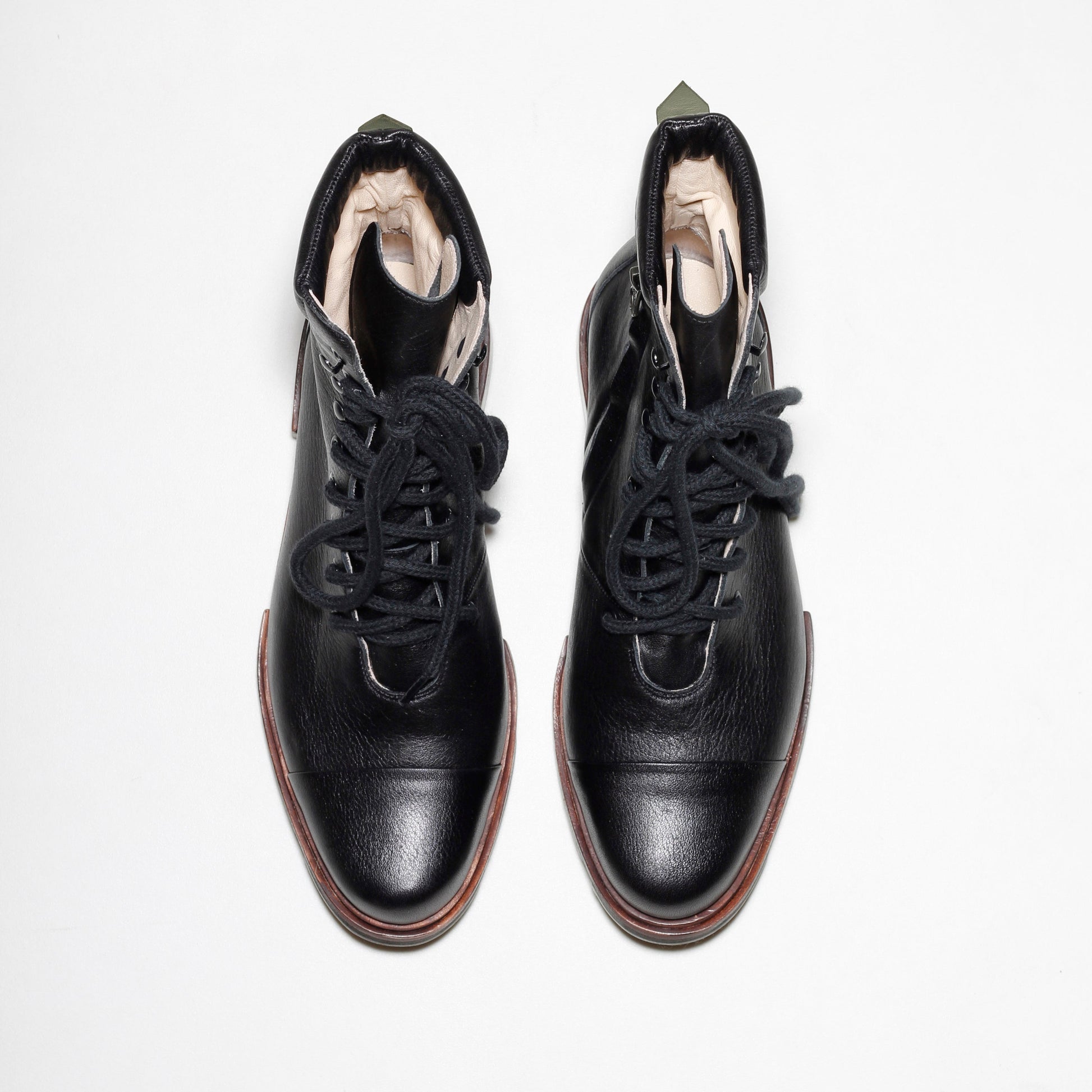 The Uma Black Boots feature a sleek, minimalistic design with a contrasting back panel and fabric laces, blending elegance with subtle detail. Crafted with a bespoke leather and rubber sole, they offer both durability and comfort. Their versatile style pairs effortlessly with trousers, skirts, or dresses, making them an ideal choice for autumn and winter wardrobes.
